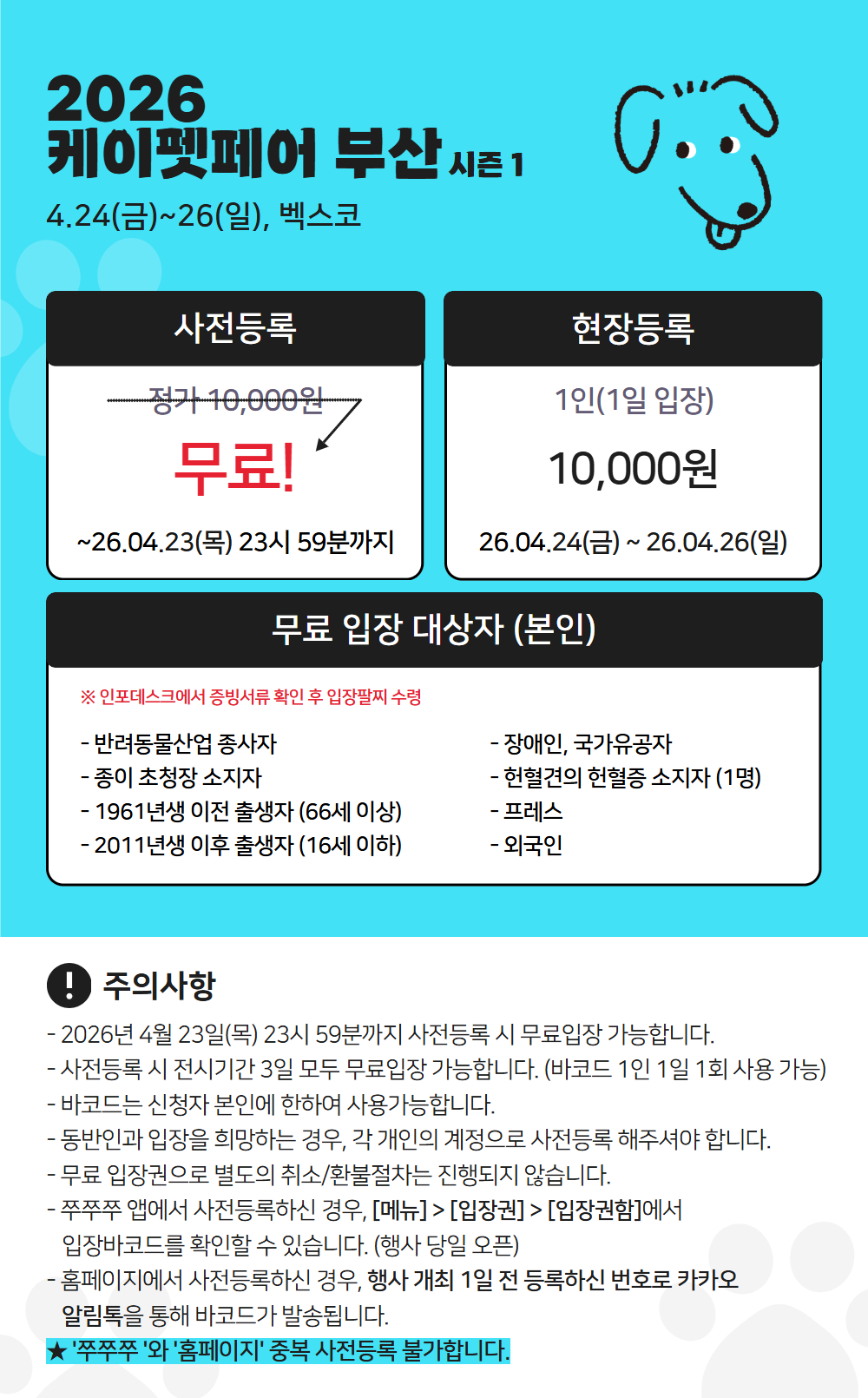 ※ 무료입장 대상 : 2011년생 이후 출생자(16세 이하)/1961년생 이전 출생자(66세 이상)/장애인(복지카드 소지자)/국가 유공자(신분증 소지자)/헌혈견 헌혈증 소지자(1인)/반려동물산업 종사자/프레스/외국인