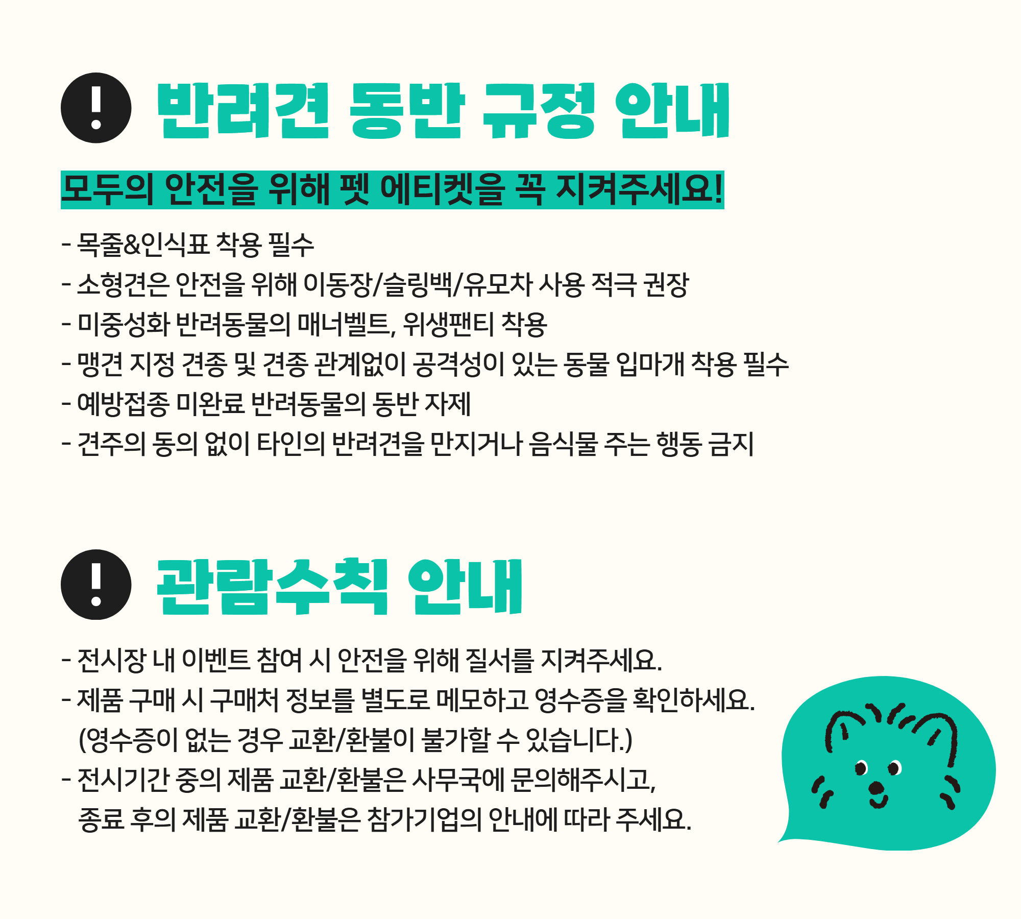 – 반려동물 동반 전시회 특성상 많은 반려동물이 한 곳에 모여 혼잡할 수 있습니다.