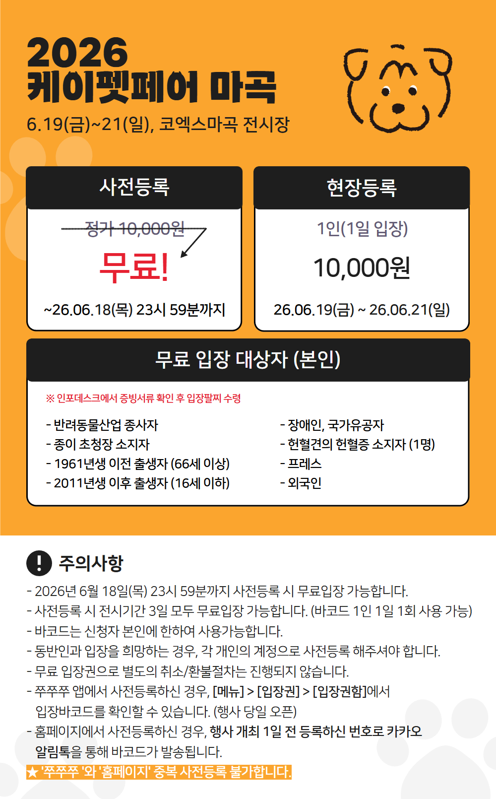 케이펫페어는 유료 전시회로, 사전등록을 하시면 무료 입장 혜택을 제공해드리고 있습니다.