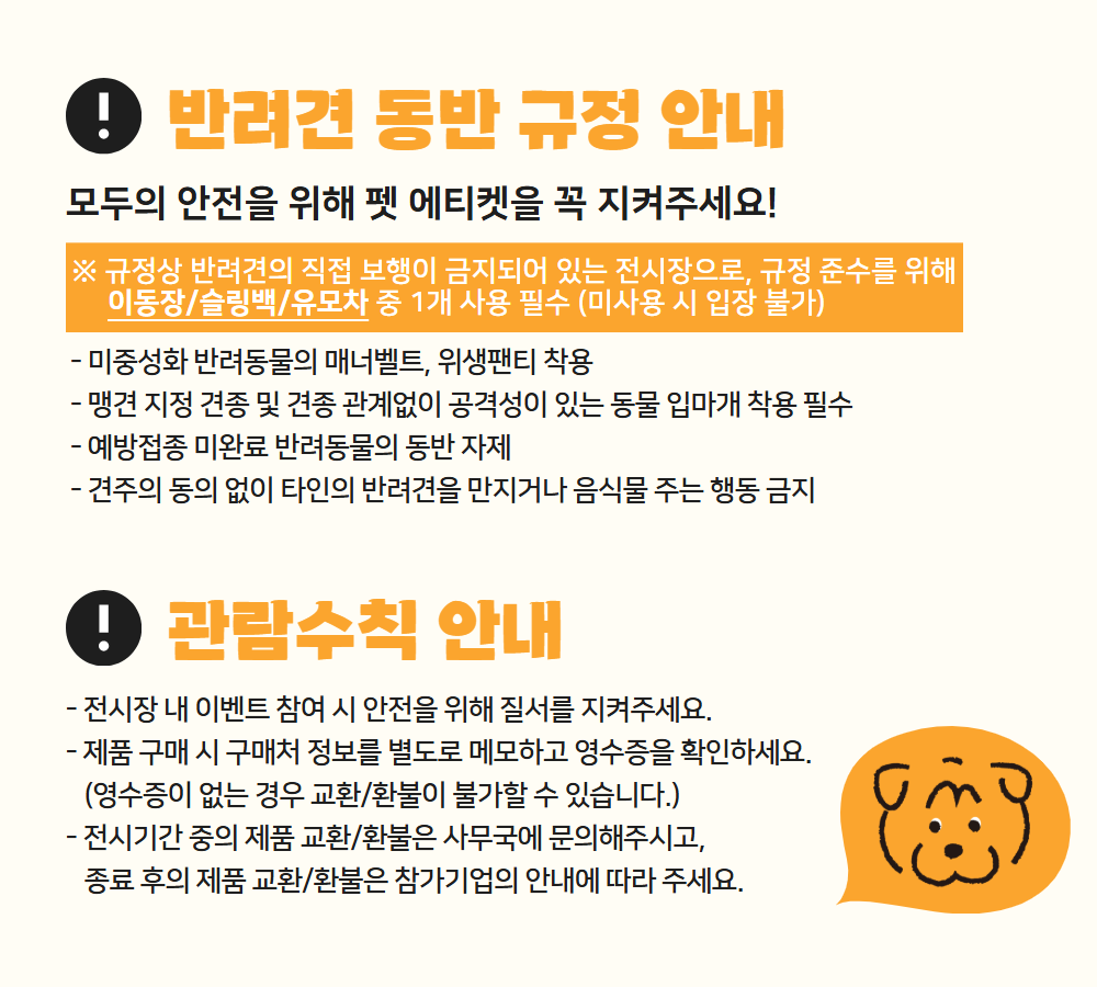 – 반려동물 동반은 가능하나 전시장 규정상 반려동물의 직접 보행이 불가합니다.