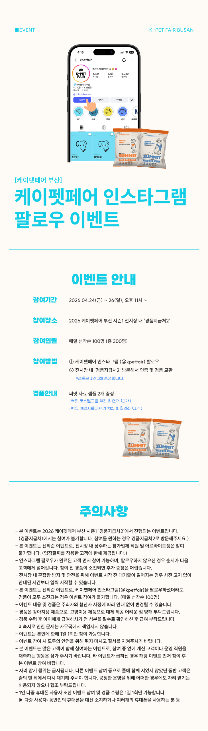 [2026 케이펫페어 부산 시즌1] 케이펫페어 인스타그램 팔로우하면 사료 샘플 2개 증정!✨